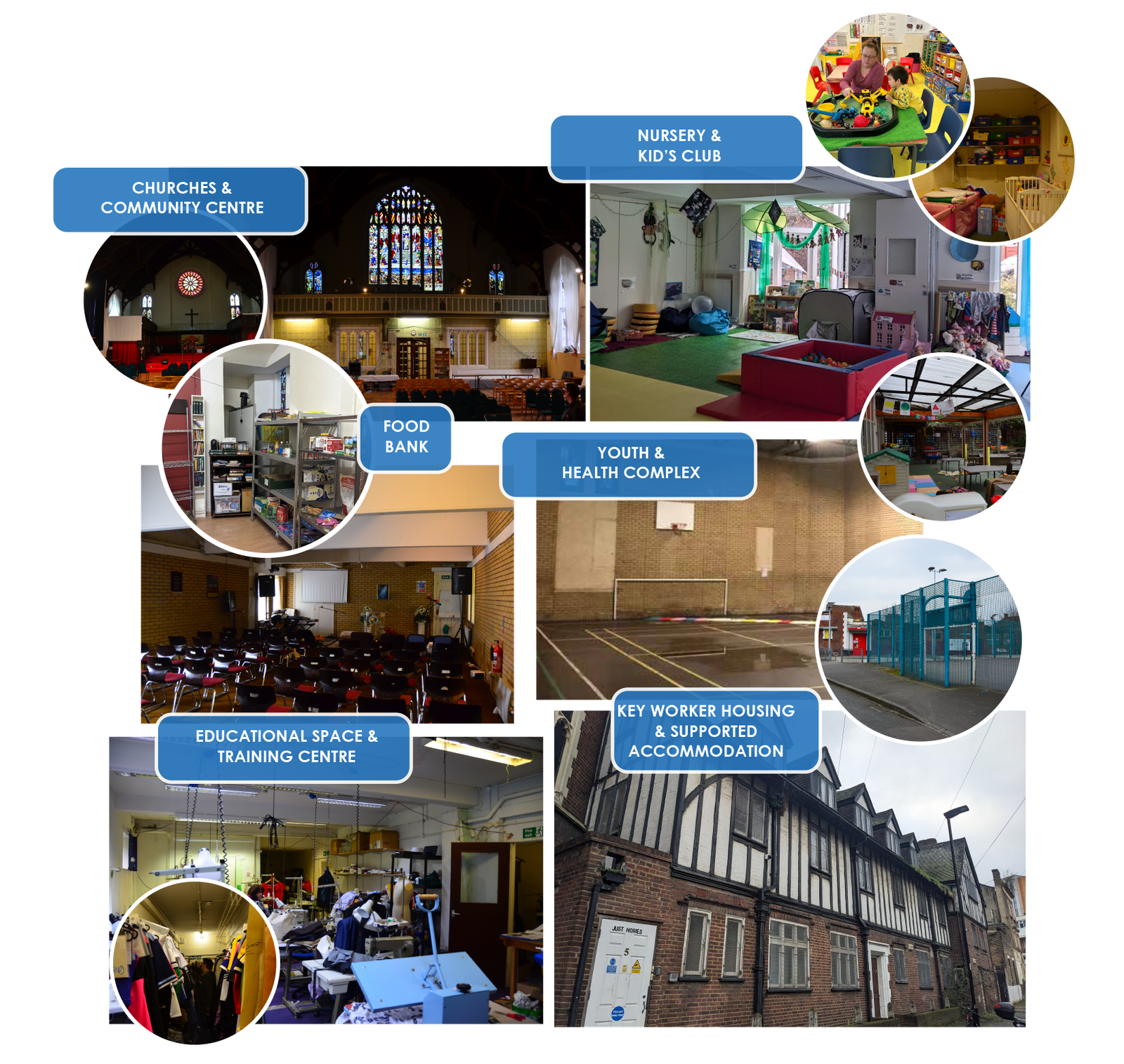 Employment training and mentoring, ESOL, parenting/work skills, third sector office space, business incubator space.